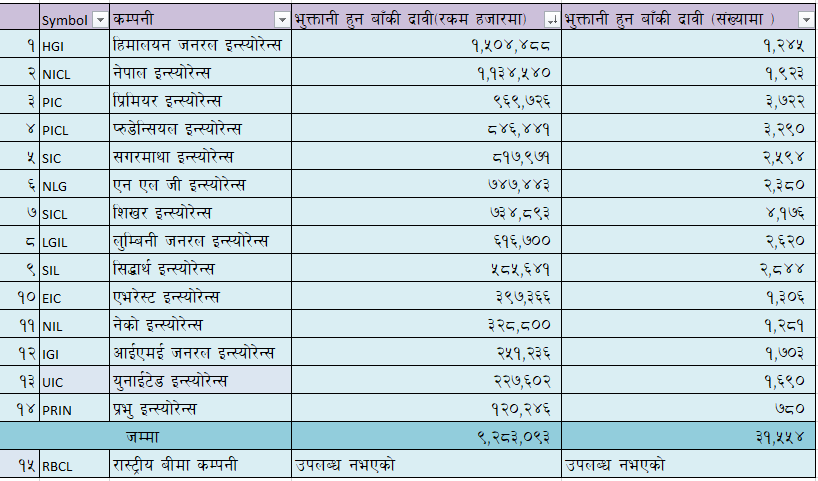 सबै भन्दा धेरै भुक्तानी हुनबाँकी दावी रकम हिमालयन जनरल इन्स्योरेन्सको रहेको छ । हिमालयन जनरल इन्स्योरेन्सको १ अर्ब ५० करोड बराबरको दावी भुक्तानी हुनबाँकी छ । त्यस्तै दोस्रोमा नेपाल इन्स्योरेन्स पर्दछ । नेपाल इन्स्योरेन्सको १ अर्ब १३ करोड बराबरको दावी भुक्तानी हुनबाँकी छ ।