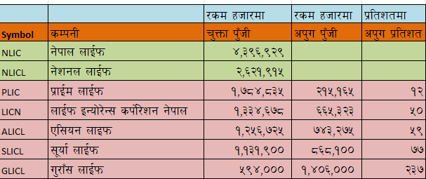 त्यस्तै एन एल जी इन्स्योरेन्स र प्रुडियन्सल इन्स्योरेन्सले अझै आफ्नो पुँजी ५६ प्रतिशतले वृद्धि गर्नु पर्ने देखिन्छ ।