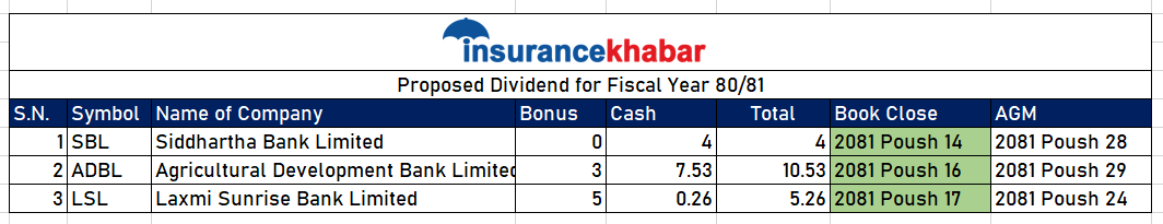 तर ११ वाणिज्य बैंकमध्ये सिद्धार्थ बैंक, कृषि विकास बैंक र लक्ष्मी सनराइज बैंकको भने प्रस्तावित लाभांश प्रयोजनको लागि बुक क्लोज आउन बाँकी रहेको छ ।