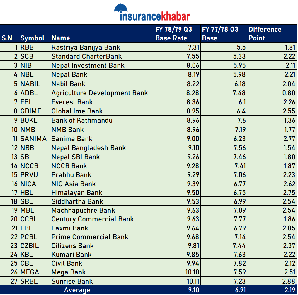 सम्पूर्ण बैंकहरुले चालु आर्थिक वर्ष ७८/७९ को तेश्रो त्रैमासको वित्तिय विवरण सार्वजनिक गरेका छन् । २७ वाणिज्य बैंकहरुको औसत बेस रेट २ दशमलव १९ प्रतिशतले वृद्धि भएको छ । गत आर्थिक वर्षको चैत्र मसान्तसम्म औसतमा ६.९१ प्रतिशत रहेको बेस रेट चालु आर्थिक वर्षको चैत्र मसान्तसम्म ९.१० प्रतिशत पुगेको छ। बेस रेट वृद्धि भएसँगै कर्जाको व्याजदर पनि वृद्धि भएको छ ।
