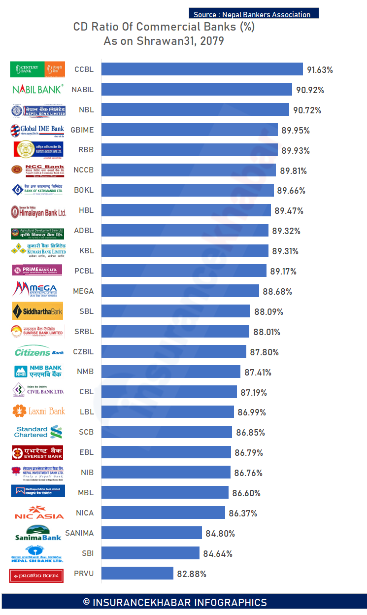 २६ वाणिज्य बैंक मध्ये सेञ्चुरी कर्मसियल बैंकको सिडी रेसियो सबै भन्दा धेरै ९१ दशमलव ६३ प्रतिशत रहेको छ भने नबिल बैंकको ९० दशमलव ९२ प्रतिशत र नेपाल बैंकको ९० दशमलव ७२ प्रतिशत रहेको छ ।