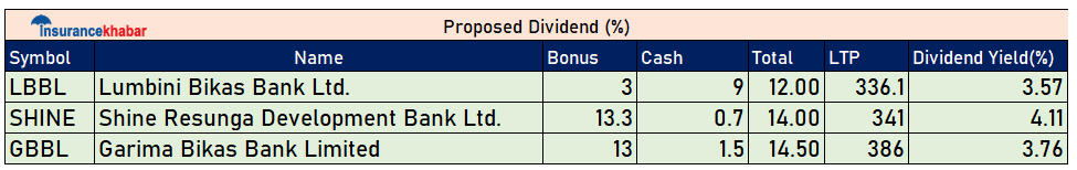 त्यस्तै, शाइन रेसुङ्गा डेभलपमेण्ट बैंकले १३ दशमलव ३० प्रतिशत बोनस शेयर र कर प्रयोजनको लागि शून्य दशमलव ७० प्रतिशत नगद लाभांश गरी १४ प्रतिशत लाभांश प्रस्ताव गरेको छ । त्यस्तै लुम्बिनी विकास बैंकले ३ प्रतिशत बोनस शेयर र ९ प्रतिशत नगद लाभांश गरी जम्मा १२ प्रतिशत लाभांश प्रस्ताव गरेको छ ।