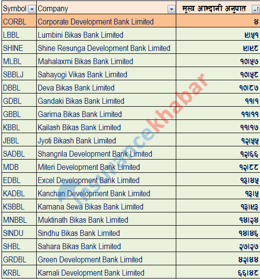 मूल्य आम्दानी अनुपातको आधारमा लुम्बिनी विकास बैंक र शाईन रेसुंगा विकास बैंक राम्रो छन्। दुवैको मूल्य आम्दानी अनुपात १० गुणा मुनी छ। कर्णाली डेभलपमेन्ट बैंकको मूल्य आम्दानी अनुपात सबै भन्दा धेरै ६६ गुणा छ।