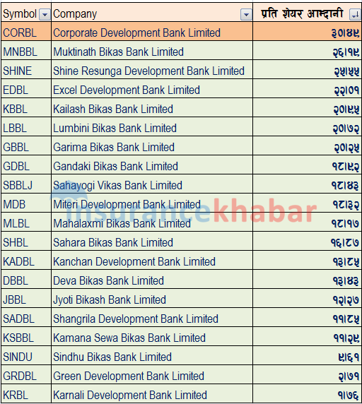 नोट : कर्पोरेट डेभलपमेन्ट बैंकको जगेडा कोष ऋनात्मक भएको र खराब कर्जा ३० प्रतिशत माथि भएकाले प्रति शेयर आम्दानी ३० हुदा पनि यो सूचीमा समावेश नगरिएको।