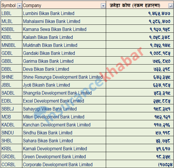 जगेडा कोषको आधारमा लुम्बिनी विकास बैंक राम्रो छ। लुम्बिनी विकास बैंकको जगेडा कोषमा १ अर्ब ४६ करोड संचित छ। विकास बैंक मध्ये कर्पोरेट डेभलपमेन्ट बैंकको जगेडा कोष ऋनात्मक छ। कर्पोरेट डेभलपमेन्ट बैंकको जगेडा कोष १ करोड ७० लाख रुपैयाँ ऋनात्मक छ।