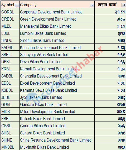 खराब कर्जाको आधारमा कर्पोरेट डेभलपमेन्ट बैंकको खराब कर्जा सबै भन्दा धेरै छ। कर्पोरेट डेभलपमेन्ट बैंकको खराब कर्जा ३१ दशमलव ८१ प्रतिशत छ। त्यो भन्दा बाहेक सबै विकास बैंकको खराब कर्जा ५ प्रतिशत भन्दा मुनी छ।
