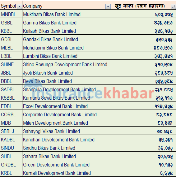 खुद नाफाको आधारमा मुक्तिनाथ विकास बैंक अघि छ। मुक्तिनाथ विकास बैंकले चालु आर्थिक वर्षको तेश्रो त्रैमास सम्म ६० करोड २० लाख खुद नाफा गरेको छ।