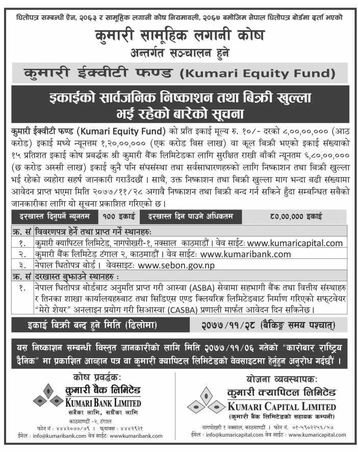 काठमाडौं । कुमारी क्यापिटल लिमिटेडले फागुन १४ गते, शुक्रबारदेखि निष्काशन तथा बिक्री खुल्ला गरेको कुमारी इक्विटी फन्ड सामुहिक लगानी कोषमा आवेदन दिने समय लम्बिएको छ ।