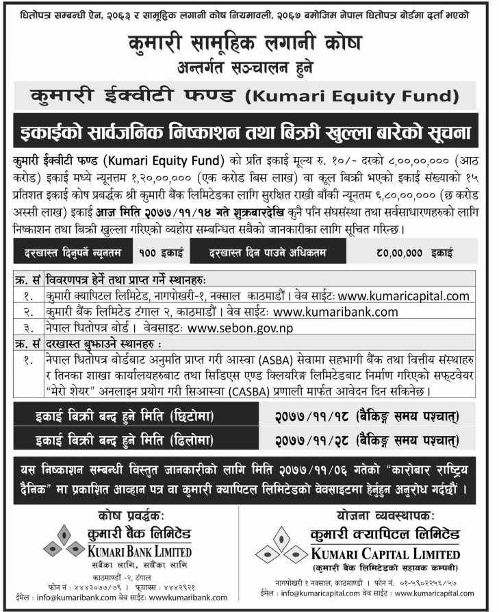 काठमाडौं । कुमारी क्यापिटल लिमिटेडले आज देखि कुमारी इक्विटी फन्ड नामक सामुहिक लगानी कोष सार्वजनिक निष्काशन तथा बिक्री खुल्ला गरेको छ । क्यापिटलले प्रतिइकाई १० रुपैयाँ अंकित दरमा ८ करोड इकाई निष्काशन तथा बिक्री खुल्ला गरेको हो ।