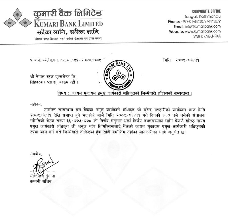 कम्पनीका प्रमुख कार्यकारी अधिकृत सुरेन्द्र भण्डारीको कार्यकाल असार ३१ गते समाप्त भएकाले कायम मुकायम प्रमुख कार्यकारी अधिकृतको जिम्मेवारी तिमिल्सिनालाई दिएको बैंकले जनाएको छ ।