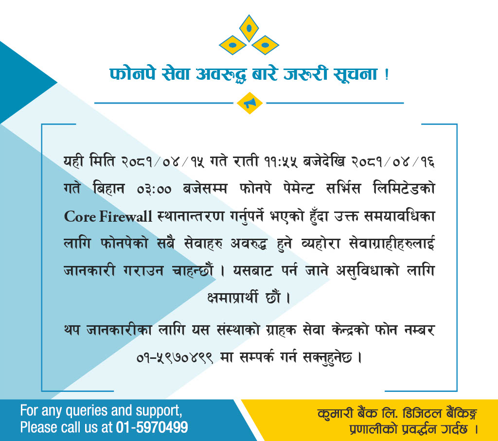 काठमाडौं । कुमारी बैंकको फोनपे सेवा आवरुद्ध हुने भएको छ । बैंकको आज साउन १५ गते राती ११ः५५ बजेबाट भोलि साउन १६ गते विहान ३ बजेसम्म फोनपे सर्भिस लिमिटेडको कोर फायरवाल स्थान्तरण गर्नुपर्ने भएकाले उक्त समउअवधिका लागि सबै सेवा आवरुद्ध हुने भएको हो । यसबाट ग्राहकमा पर्न जाने असुविधाप्रति बैंकले क्षमा मागेको छ ।