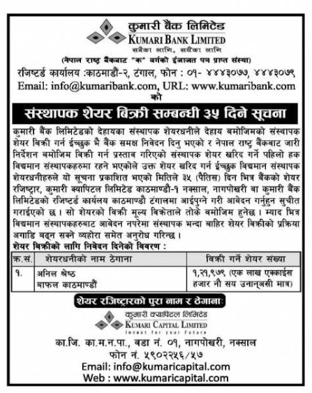 काठमाडौ । कुमारी बैंक लिमिटेडले संस्थापक सेयर बिक्री गर्ने भएको छ । बैंकले आफ्नो संस्थापक सेयरधनीको नाममा रहेको १ लाख २१ हजार ९ सय ७९ कित्ता सेयर बिक्री गर्न लागेको हो ।