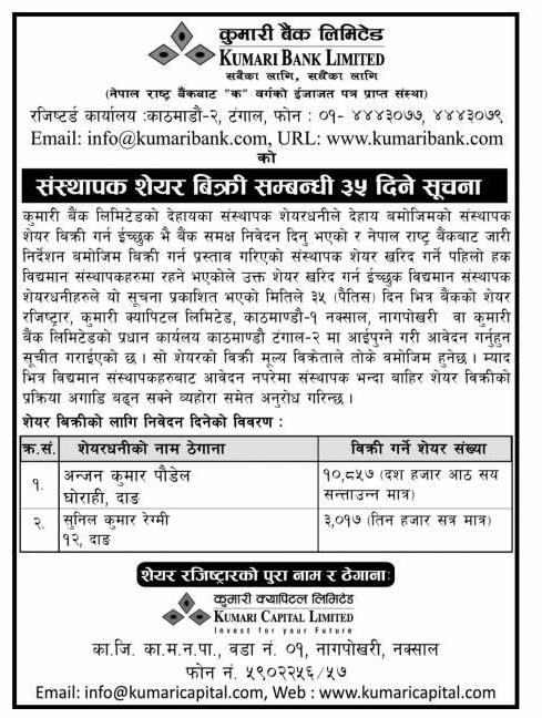 बैंकका संस्थापक शेयरधनीहरूको नाममा रहेको १३ हजार ८७४ कित्ता संस्थापक शेयर बिक्री गर्न लागेको जनाएको छ । नेपाल राष्ट्र बैंकको निर्देशन बमोजिम सर्वप्रथम संस्थाका संस्थापक शेयरधनीहरुलाई नै प्राथमिकता दिनुपर्ने भएकाले संस्थापक शेयर खरिद गर्न इच्छुक संस्थापक शेयरधनीहरुलाई सूचना प्रकाशन भएको मितिले ३५ दिनभित्र आवश्यक कागजपत्र संकलन गरेर म्पनीको शेयर रजिष्ट्रार कुमारी क्यापिटल नक्साल वा बैंकको प्रधान कार्यालय टंगाल, काठमाडौँमा आइपुग्ने गरी निवेदन दिन आग्रह गरेको छ ।
