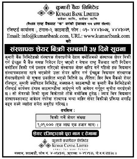 काठमाडौं । कुमारी बैंक लिमिटेडले एक लाख एक हजार कित्ता संस्थापक शेयर बिक्री गर्ने भएको छ । बैंकले एक सूचना प्रकाशन गर्दै नेपाल राष्ट्र बैंकको निर्देशन बमोजिम सर्वप्रथम बैंकका संस्थापक शेयरधनीहरुलाई नै प्राथमिकता दिनुपर्ने भएकाले संस्थापक शेयर खरिद गर्न इच्छुक संस्थापक शेयरधनीहरुलाई सूचना प्रकाशन भएको मितिले ३५ दिनभित्र आवेदन दिन बैंकले आग्रह गरेको छ ।