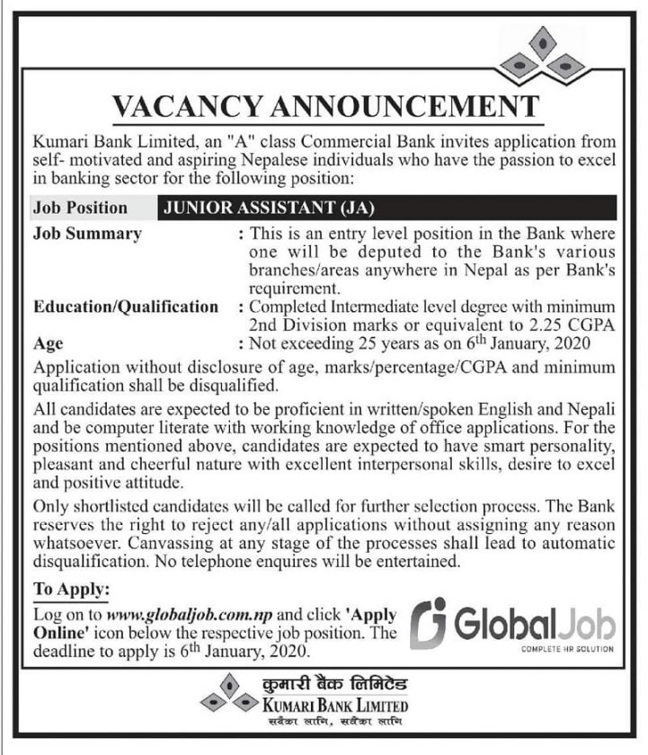 काठमाडौं । कुमारी बैंकले कर्मचारीको माग गरेको छ । बैंकले जूनियर असिस्टेन्टका लागि कर्मचारीको माग गरेको जनाएको छ ।