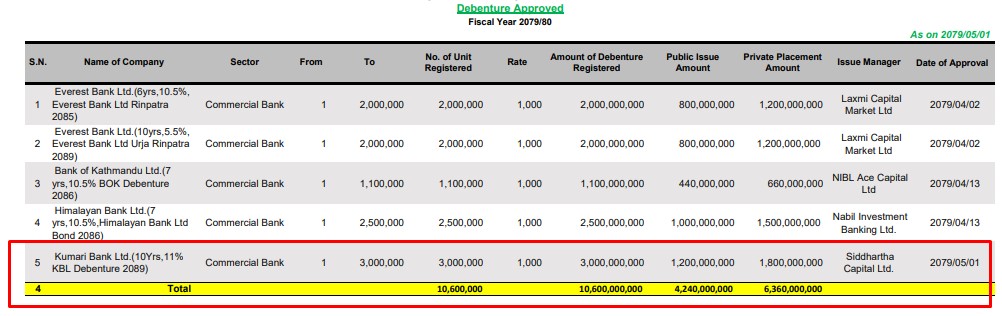 कम्पनीले आगामी १० वर्षसम्मका लागि वार्षिक ११ प्रतिशत ब्याजदरमा केबिएल डिबेञ्चर २०८९ नामक ऋणपत्र निष्कासन गर्न अनुमति पाएको हो । कम्पनीले कुल ३० लाख कित्ता ऋणपत्रमध्ये १२ लाख कित्ता सर्वसाधारणको लागि निष्काशन गर्नेछ भने बाँकी रहेको १८ लाख कित्ता ऋणपत्र व्यक्तिगत तवरबाट विक्री गर्नेछ ।