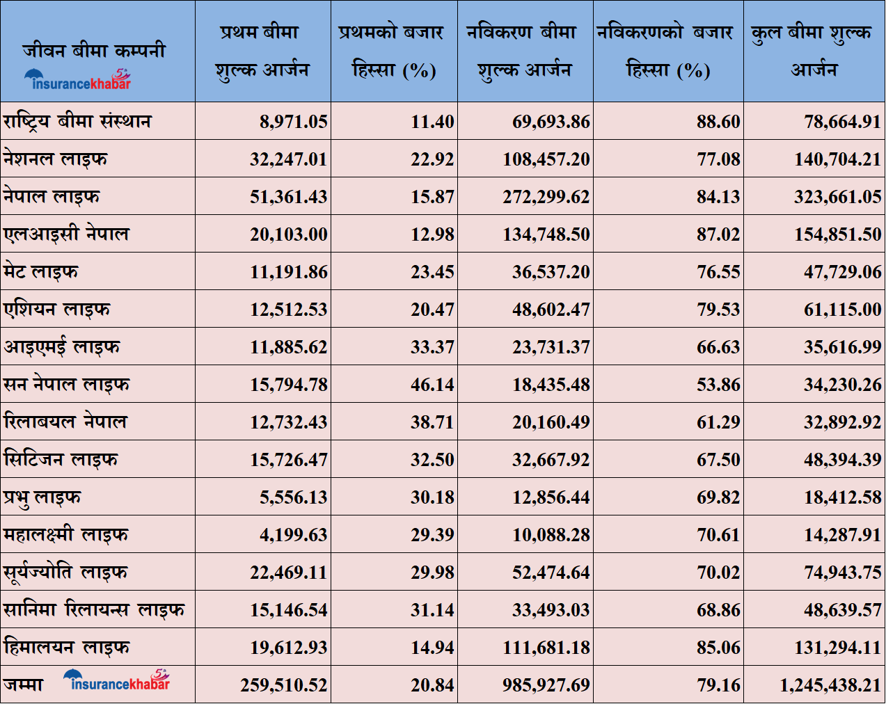 पुराना भन्दा नयाँ कम्पनीमा नविकरणको हिस्सा धेरै छ । पुराना कम्पनीमा भने नविकरणको हिस्सा धेरै छ । नेशनल लाइफले भने ७७ प्रतिशत नविकरण र २२.९२ प्रतिशत प्रथम बीमा शुल्क आर्जन गरेको छ ।