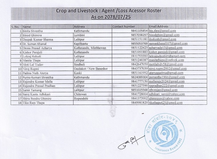 काठमाडौं । बीमा समितिले कृषि तथा पशुपन्छी बीमाको अभिकर्ता सहितको क्षति मूल्याङ्कनका लागि १८ जनाको रोष्टर बनाएको छ । समितिले केहि समय यस्तो रोष्टरमा आबद्ध हुनका लागि सार्वजनिक सूचना आह्वान गरेको थियो । यस क्रममा योग्यता पुगेका आवेदक मध्ये १८ जनालाई रोष्टरमा चयन गरेको छ ।