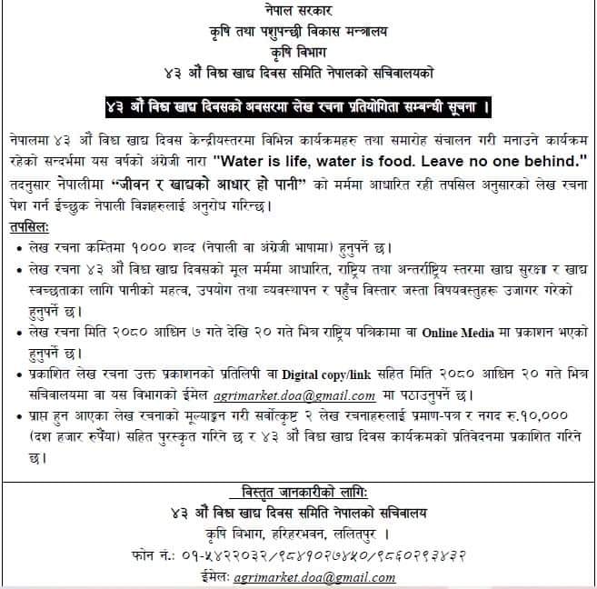 कृषि तथा पशुपन्छी विकास मन्त्रालयले विश्व खाद्य दिवसको अवसरमा लेख रचना प्रतियोगिता गर्दै