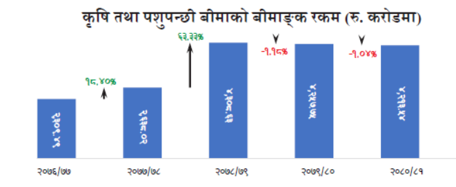 कृषि तथा पशुपन्छी बीमाको बीमांक आर्थिक वर्ष २०७६।७७ मा २२ अर्ब ९ करोड ४९ लाख रहेकोमा आर्थिक वर्ष २०७७।७८ मा १९.४० प्रतिशतले वृद्धि भएर २६ अर्ब ३८ करोड रुपैयाँ बीमांक कायम भएको थियो । आर्थिक वर्ष २०७७।७८ को तुलनामा आर्थिक वर्ष २०७८।७९ मा बीमांक रकममा ६३.३३ प्रतिशतले उल्लेख्य वृद्धि भएर ४३ अर्ब ९ करोड रुपैयाँ पुगेको थियो। त्यसैगरी आर्थिक वर्ष २०७९।८० मा १.१८ प्रतिशतले संकुचन आएर बीमांक रकम ४२ अर्ब ५७ करोड ७५ लाख रुपैयाँ पुगेको थियो। आर्थिक वर्ष २०८०।८१ मा भने बीमांक रकम १.०४ प्रतिशतले घटेर ४२ अर्ब १३ करोड ५४ लाख रुपैयाँ पुगेको थियो।