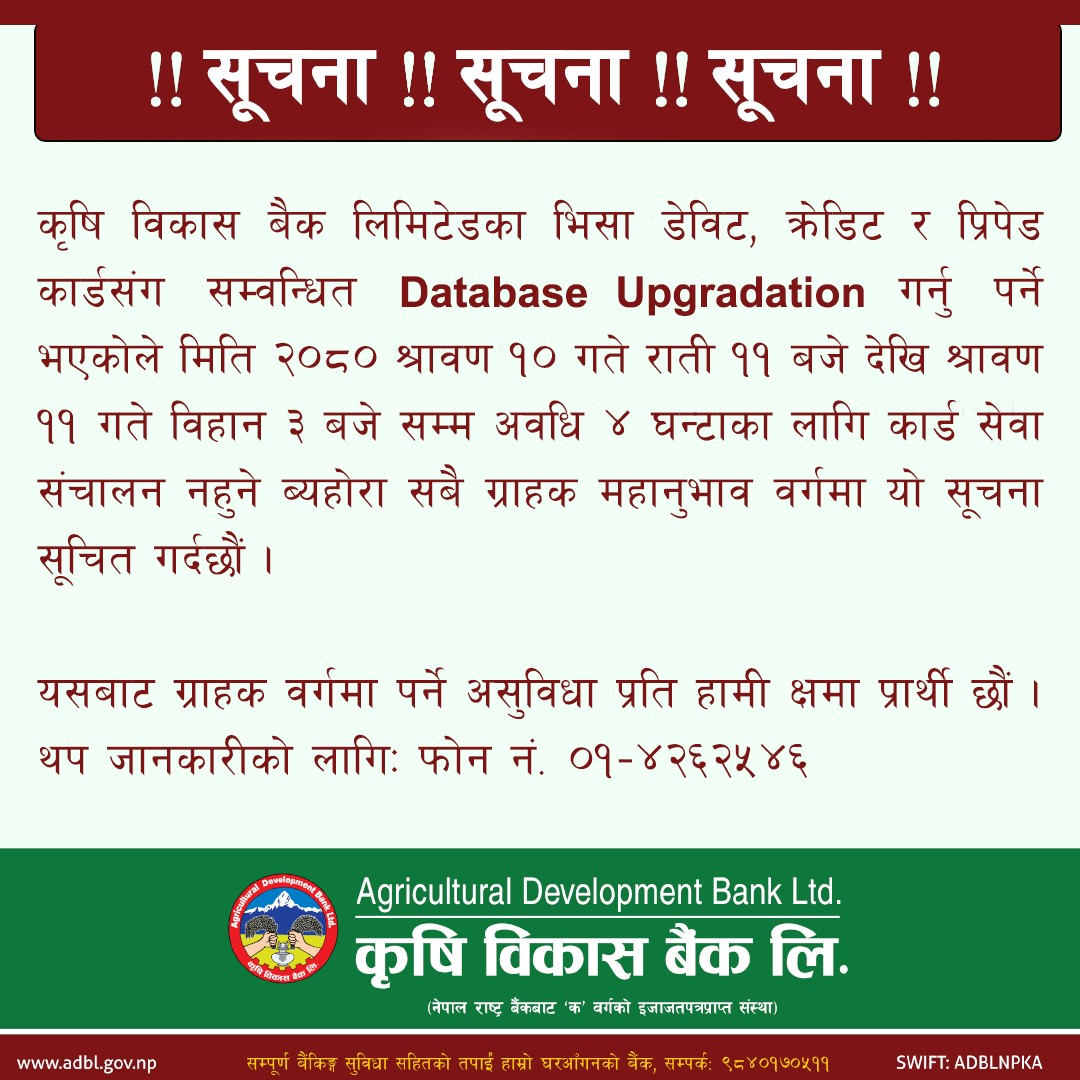 काठमाडौं । कृषि विकास बैंक लिमिटेडको कार्ड सेवा ४ घण्टा अवरुद्ध हुने भएको छ । बैंकले एक सुचना जारी गर्दै कम्पनीको भिसा डेविट, क्रेडिट र प्रिपेड कार्ड सम्बन्धी Database Upgradation गर्नु पर्ने भएकाले कार्ड सम्बन्धी सेवा ४ घण्टा अवरुद्ध हुने जनाएको हो । कम्पनीको उक्त सेवा साउन १० गते राति ११ बजेदेखि बिहान ३ बजेसम्म अवरुद्ध हुने बैंकले जनाएको छ ।