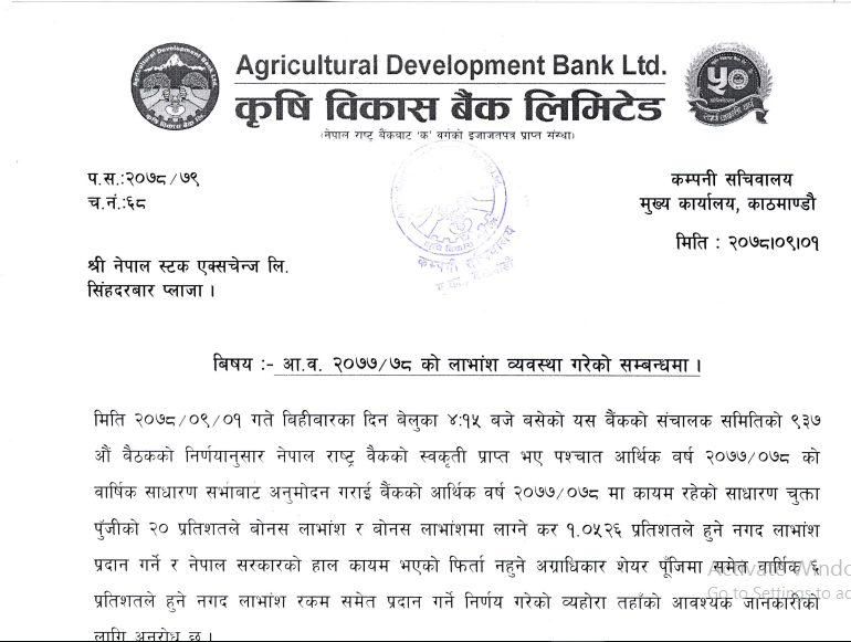 काठमाडौं । कृषि विकास बैंकले लाभांश प्रस्ताव गरेको छ। कम्पनीको बिहिबार बसेको संचालक समितिको बैठकले आर्थिक वर्ष ७७र७८ को मुनाफाबाट आफ्ना शेयरधनीलाई वितरण गर्ने लाभांश प्रस्ताव गरेको हो ।