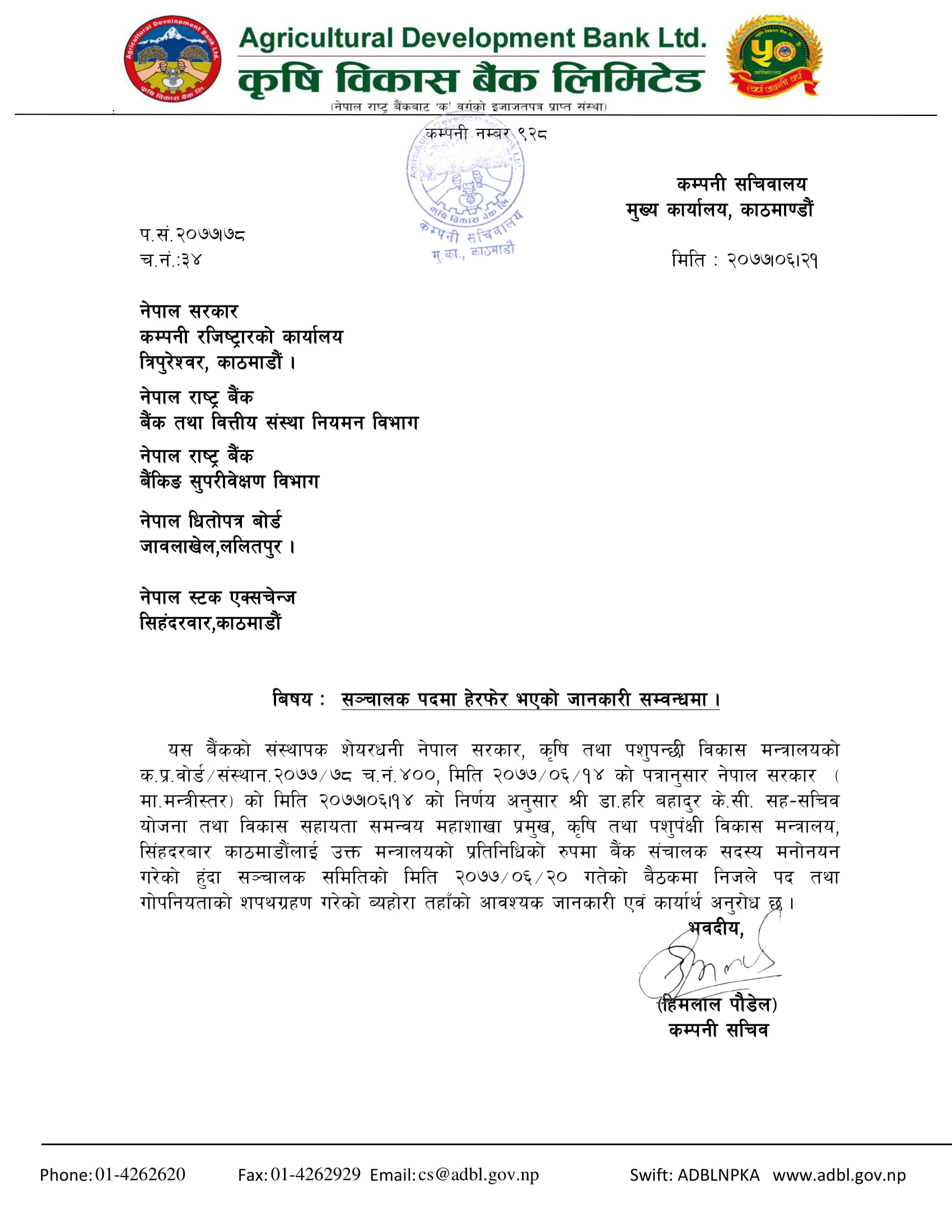 असोज २० गते बसेको सञ्चालक समितिको बैठकमा उनलाई पद तथा गोपनियताको सपथ ग्रहण गराइएको बैंकले जानकारी दिएको छ ।