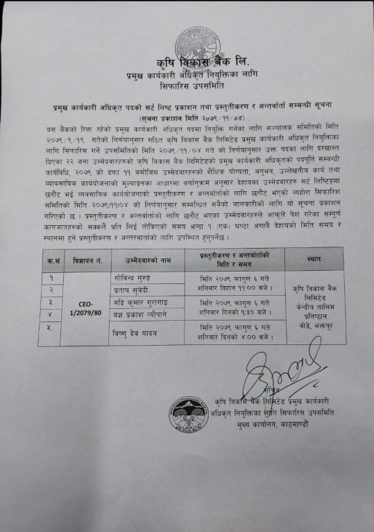 सीईओ पदका लागि २२ जनाको आवेदन परेको थियो । सर्टलिष्टमा परेकाहरुको भोलि (शनिवार) अन्तरवार्ता रहेको छ । कृषि विकास बैंकका तत्कालीन सीईओ अनिल उपाध्यायको कार्यकाल सकिएपछि रिक्त रहेको सीर्इओ पदका लागि १ महिनाअघि दरखास्त आह्वान गरेको थियो ।