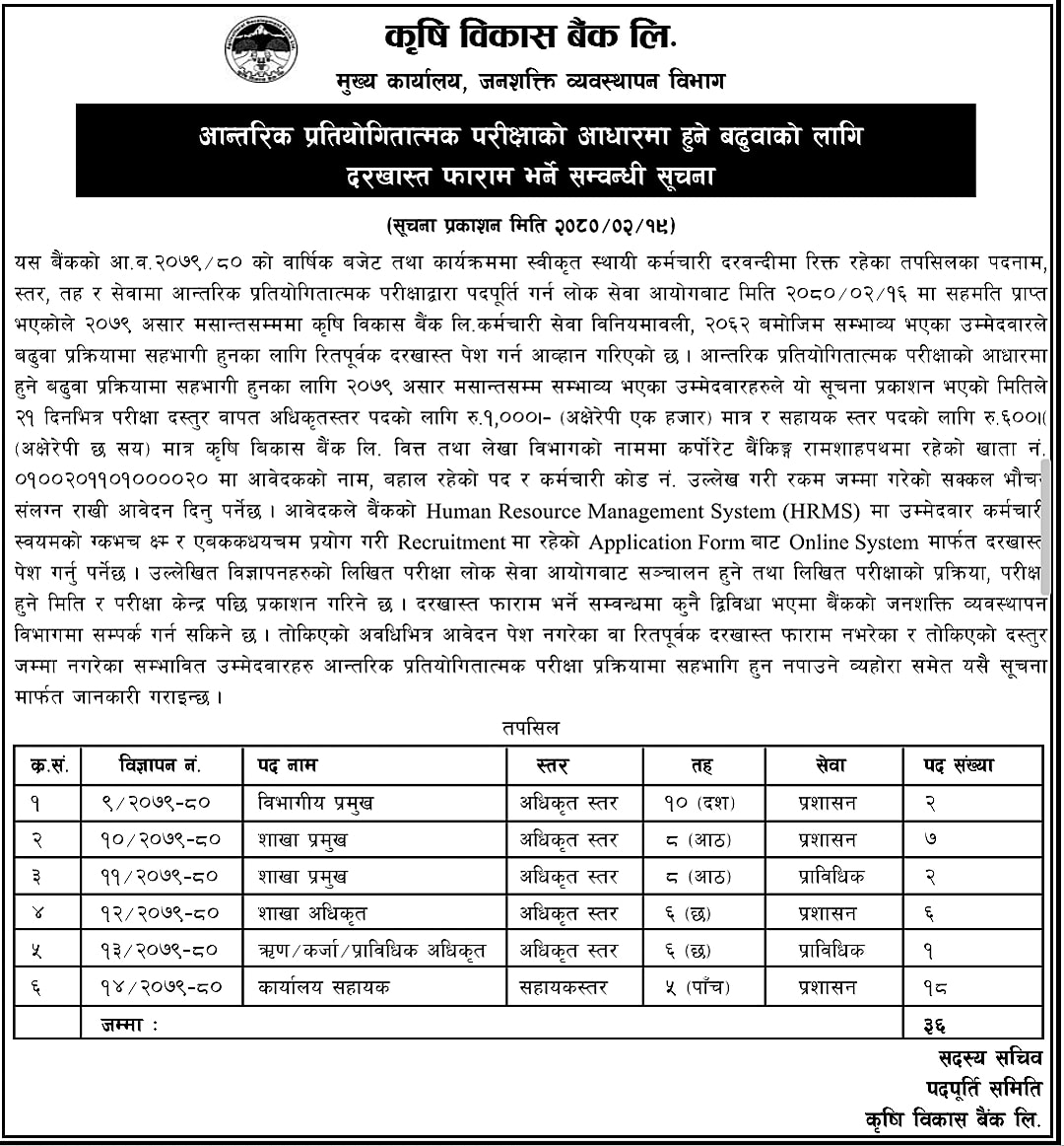 काठमाडौं । कृषि विकास बैंकले विभिन्न पदका भारी संख्यामा कर्मचारी माग गरेको छ । बैंकले १७९ पदका लागि कर्मचारी माग गरेको हो । बैंकले सहायक र अधिकृत पदका लागि धेरै संख्यामा कर्मचारीको माग गरेको हो । बैंकले खुलातर्फ ९२ जना, महिला २८ जना, आज.ज २७ जना, मधेसी १७ जना, दलित ९ जना, अपाङग २ जना माग गरेको हो । ईच्च्छुक नागरिकले आज जेठ १९ गतेदेखि असार ७ गतेभित्र आवेदन दिनुपर्नेछ । उक्त पदका लागि न्युनतम १२ पासदेखि स्नातकोत्तर गरेको हुनुपर्नेछ । उक्त पदहरुमा दोब्बर दस्तुर तिरी असार ८ गतेदेखि असरा १४ गतेसम्म् आवेदन दिन सकिनेछ ।