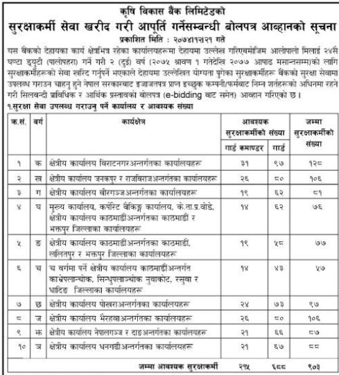 काठमाडौं। कृषि विकास बैंकले दुर्इ वर्षकालागि ९०३ जना सुरक्षाकर्मी माग गरेको छ। बैंकले केन्द्रीय तथा क्षेत्रीय कार्यालयको लागि २ सय १५ जना कमाण्डर र ६ सय ८८ जना गार्डको माग गरेको हो।