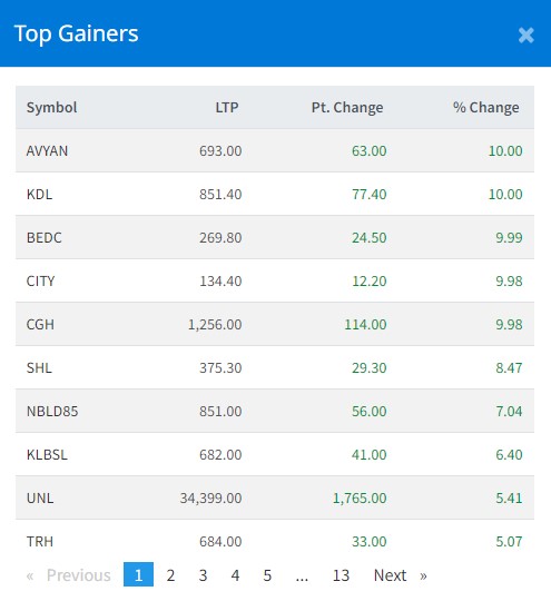 यसैगरी, आज कालिञ्चोक दर्शनको शेयरमा सकारात्मक सर्किट लाग्दा प्रति शेयर मूल्य ८५१ रुपैयाँ कायम भएको छ । भूगोल इनर्जी डेभलपमेन्ट कम्पनीको शेयर ९.९९ प्रतिशतले बृद्धि हुँदा प्रति शेयर मूल्य भने २६९ रुपैयाँ कायम भएको छ ।