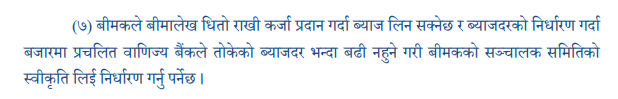 हाल बाणिज्य बैंकहरुको औसत ब्याजदर ७.६ प्रतिशत हाराहारीमा छ । यदि कम्पनीहरुले ८ प्रतिशतमै कर्जा प्रवाह गरे भने पनि उनिहरुलाई राम्रै आम्दानी हुन सक्छ । कम्पनीले बीमालेख धितोमा राखेर कर्जा दिने बाहेक अन्य खुद्रा कर्जा भने प्रवाह गर्न पाउदैन । बीमा कम्पनीले बैंकहरुमा व्याजदर घटेको समयमा बीमित सँग सोहि अनुसार व्याजदर दिनु पर्ने हुन्छ । त्यस्तै बैंकहरुमा व्याजदर बढेको समयमा बीमित सँग पनि सोहि अनुसार व्याज लिन सक्नेछन् ।