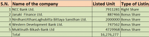 यो साता जानकी फाईनान्स, निर्धन उत्थान लघुवित्त, वेस्टर्न डेभलपमेन्ट बैंक र मुक्तिनाथ विकास बैंकको बोनस शेयर र एनसीसी बैंकको हकप्रद शेयर गरेर १ करोड ६२ लाख ७६ हजार २ सय ७७ कित्ता शेयर सुचिकृत भएको छ ।