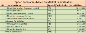 आजको मिति सम्म सबै भन्दा ठुलो बजार पुँजीकरण भएको कम्पनीमा नेपाल टेलिकम परेको छ । दोश्रोमा नबिल बैंक लिमिटेड, तेश्रोमा नेपाल इन्भेस्टमेन्ट बैंक रहेको छ भने नेपाल लाईफ चौथोमा पर्दछ ।