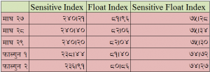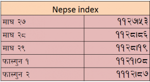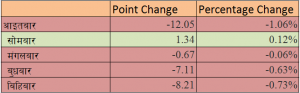 साताको ५ दिन नै खुलेको बजार कारोवारको पहिलो दिन आईतबार नेप्से परिसूचक ११३९ दशमलव ५७ को विन्दुमा खुलेको थियो । साताको अन्तिम दिन बिहिबार सम्म आइपुग्दा नेप्से परिसूचक १११२ दशमलव ८७ को विन्दुमा बन्द भएको छ । यसको मतलव यो साता नेप्से परिसूचक २६ दशमलव ७० अंकले घटेको छ ।