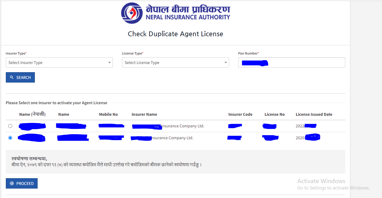जसमा सबैभन्दा पहिला बीमकको प्रकार अन्तर्गत जीवन र निर्जीवन कुन हो छुट्याउनु पर्छ । त्यस्तै लाइसेन्सको प्रकारमा व्यक्तिगत या संस्थागत कुन हो चयन गर्नु पर्नेछ । यस सँगै प्यान नम्बर भर्नु पर्नेछ । यि तीन वटा विवरण भर्ने वित्तीकै तपाईले कुन कुन बीमा कम्पनीबाट अभिकर्ता लाइसेन्स लिनु भएको छ त्यो सबै देखिनेछ ।