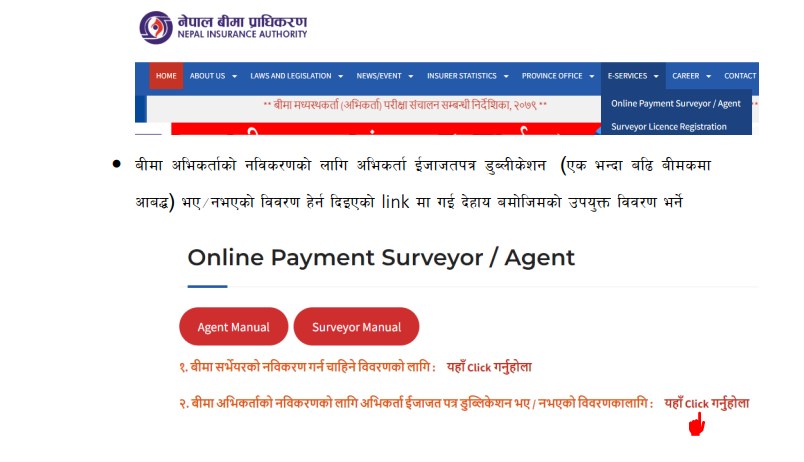 जसमा ‘इ-सर्भिस’ आइकनमा क्लिक गरेर ‘अनलाइन पेमेन्ट सर्भेयर/एजेन्स’ आइकनमा क्लिक गर्नु पर्नेछ । बीमा अभिकर्ताको नविकरणको लागि अभिकर्ता ईजाजतपत्र डुब्लीकेशन (एक भन्दा बढि बीमकमा आबद्ध) भए/नभएको विवरण हेर्न दिइएको लिन्कमा गई तोकिए बमोजिमको विवरण भर्नु पर्छ ।