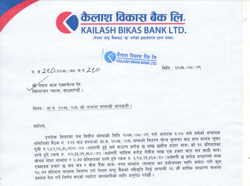 काठमाडौं । कैलाश विकास बैंकले १८ दशमलव ७७ प्रतिशत लाभांश प्रस्ताव गरेको छ । बैंकको सोमबार बसेको सञ्चालक समिति बैठकले गत आर्थिक वर्षको नाफाबाट १६ प्रतिशत बोनस सेयर र २ दशमलव ७७ प्रतिशत नगद लाभांश (कर प्रयोजनार्थ) दिने निर्णय गरेको हो ।