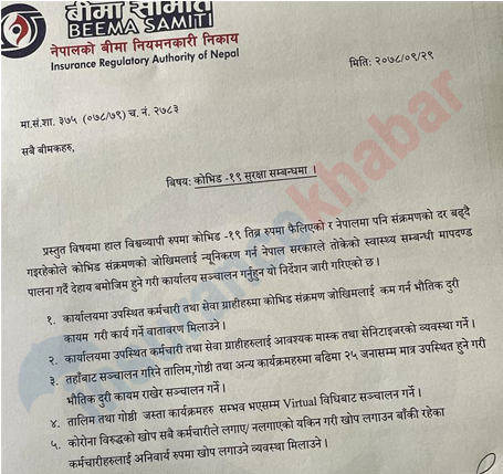 विश्वव्यापी रुपमा कोभिड १९ तिव्र रुपमा फैलिएको र नेपालमा पनि संक्रमणको दर बढ्दै गइरहेकोले कोभिड संक्रमणको जोखिमलाई न्युनिकरण गर्न नेपाल सरकारले तोकेको स्वास्थ्य सम्बन्धी मापदण्ड पलना गर्नका लागि सबै बीमा कम्पनी ५ बुँदे निर्देशन जारी गरेको छ ।