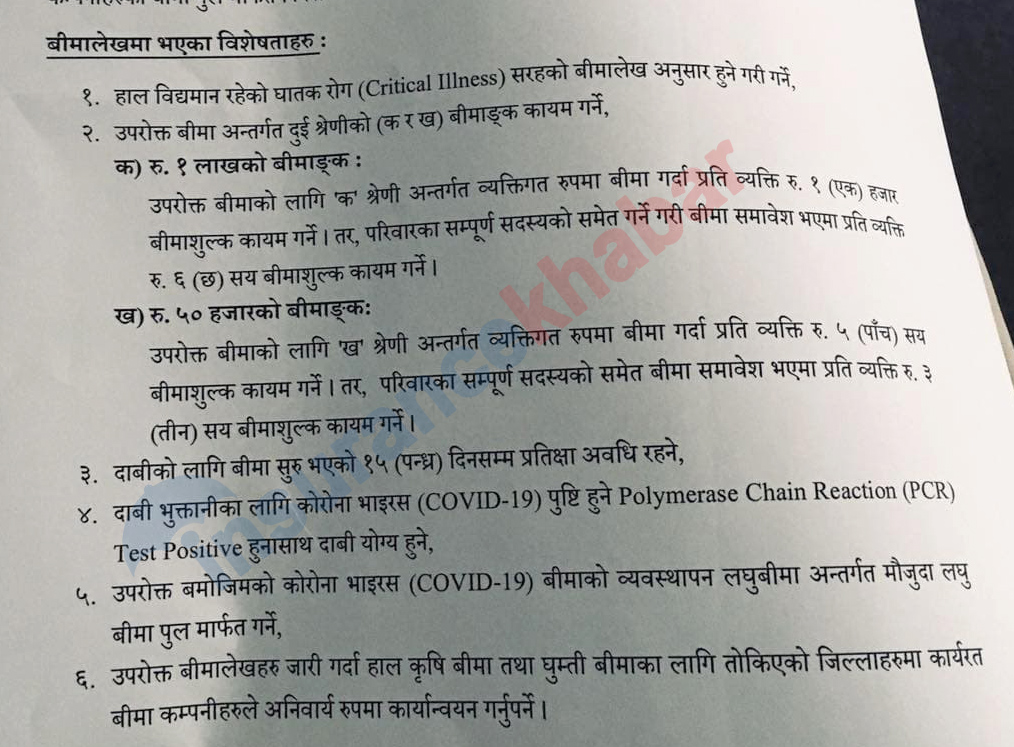 बीमा समितिले कोरोना लागेको पिसिआर परिक्षणमा पोजेटिभ देखिने वित्तिकै बीमा रकम दावी भुक्तानी लिन पाइने व्यवस्था गरेको छ । साथै बीमा समितिले सबै निर्जिवन कम्पनीहरुलाई कृषि बीमाका लागि तोकिएको जिल्लाहरु नै कार्यक्षेत्र रहने निर्णय समेत गरेको छ ।