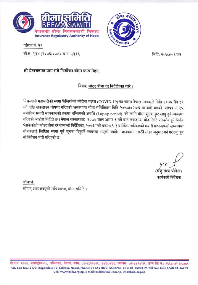 बीमा समितिले निर्जिवन बीमा क्षेत्रमा मोटर बीमामा तीन महिनाको बीमा शुल्क लेअप सुविधा दिई नविकरण गर्दा सो बराबरको बीमा शुल्क छुट दिने निर्णय गरेर यातायात व्यवसायीहरुलाई छुट दिने निर्णय गर्यो । पछि सरकारले बजेटमार्फत उद्योग कलकारखानालाई समेत बीमा रकममा छुट दिने कुरा बजेटमै समावेश भएर आएपछि बीमा समितिले सम्पत्ति बीमामा समेत छुट दिएको छ ।