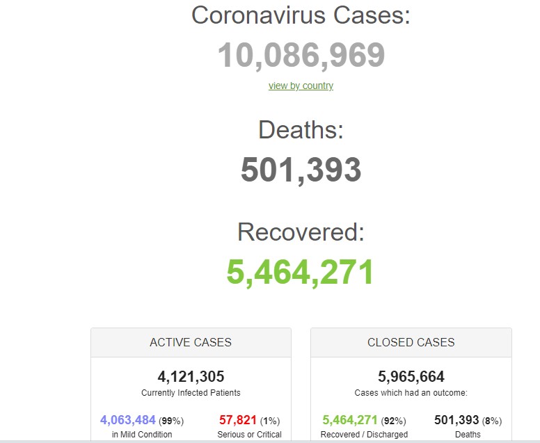 कोरोना सम्बन्धी तथ्याङ्क संकलन गर्दै आएको वल्र्डोमिटर्सले संकलन गरेको तथ्याङ्क अनुसार हालसम्म एक करोड ८६ हजार १ सय ५८ जना कोभिड(१९ बाट संक्रमित भएका छन् । त्यस्तै, सोही तथ्याङ्क अनुसार कोरोना भाइरसको कारणबाट मृत्यु हुनेको संख्या पाँच लाख १ हजार २ सय ६२ पुगेको छ । कोरोनाबाट ठीक हुनेको संख्या ५४ लाख ५७ हजार ८ सय ९८ रहेको उसको तथ्याङ्कमा उल्लेख छ ।