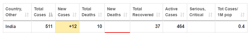 काठमाडौं । नेपालको छिमेकी मुलुक भारतमा पनि कोरोना फैलिने क्रम जारी छ। उपलब्ध तथ्यांक अनुसार अहिले सम्म भारतमा ५११ जनालाई कोरोनाको संक्रमण देखिएको छ। ५११ जना मध्य ३७ जना विरामीलाई पूर्ण रुपमा निको भैसकेको अवस्था छ भने ४६४ जनामा अझै कोरोना भाइरस संक्रमण रहेको छ। हालसम्म कोरोनाको कारण भारतमा १० जनाको मृत्यु भएको छ।