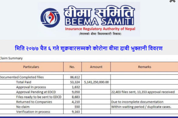 गत शुक्रवारसम्मको तथ्याङ्क अनुसार दाबी भुक्तानीका लागि पेश भएका फाइल मध्ये ८६ हजार ६१२ जनाको पुरा भएको छ । फाइल पुरा गरेका मध्ये ५३ हजार ३२४ जना दाबीका लागि योग्य भएका हुन् । तत्कालका लागि १६३२ वटा फाइल पुरा हुने प्रकृयाँमा छ । अहलेसम्मको तथ्याङ्क अनुसार कोरोना बीमा मापदण्ड अनुसार दाबी भुक्तानीको लागि अयोग्यको सख्या ५५० जना पुगेको छ ।