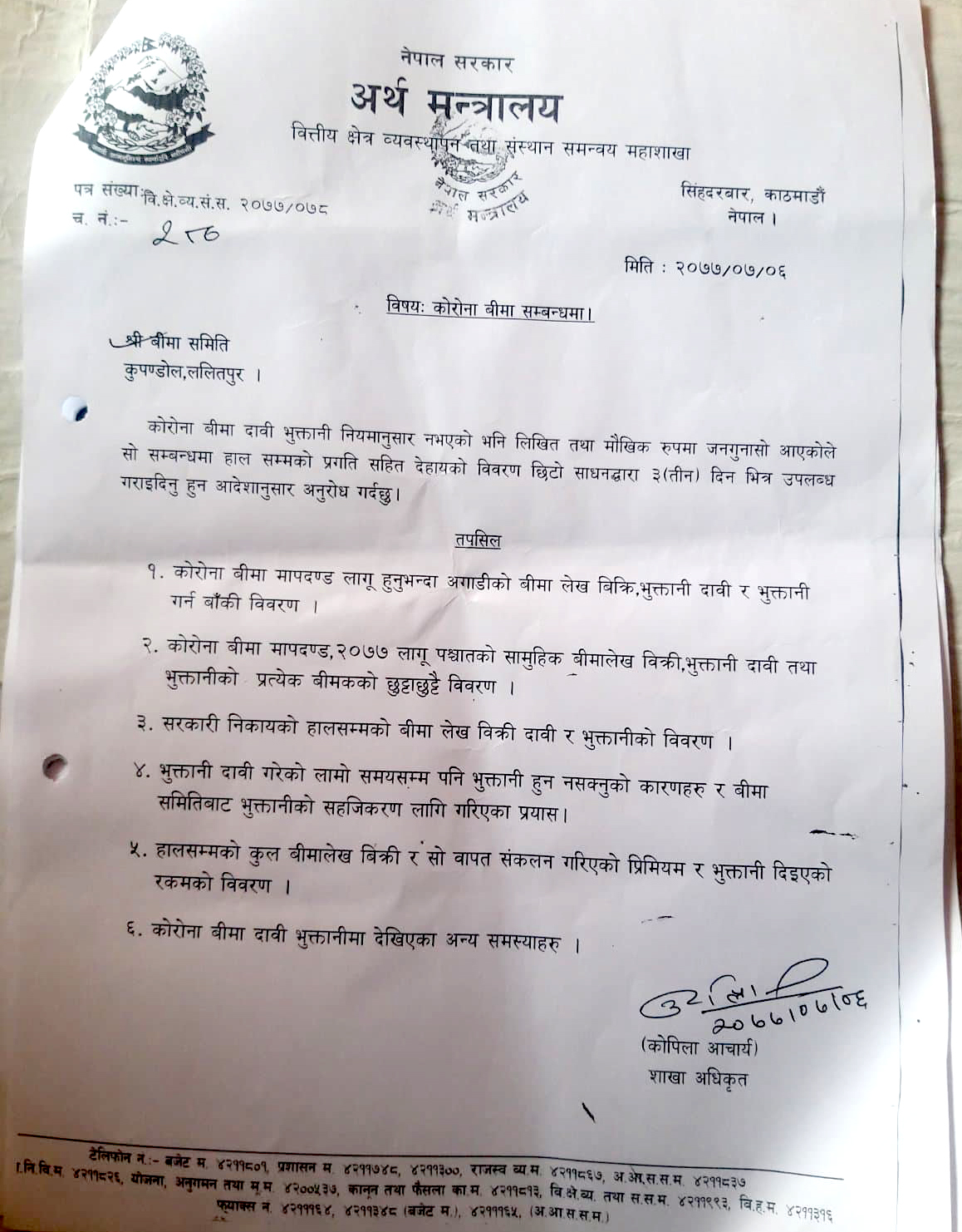 कोरोना बीमाबारे अर्थमन्त्रालयद्वारा बीमा समितिलाई ३ दिने स्पष्टिकरण
