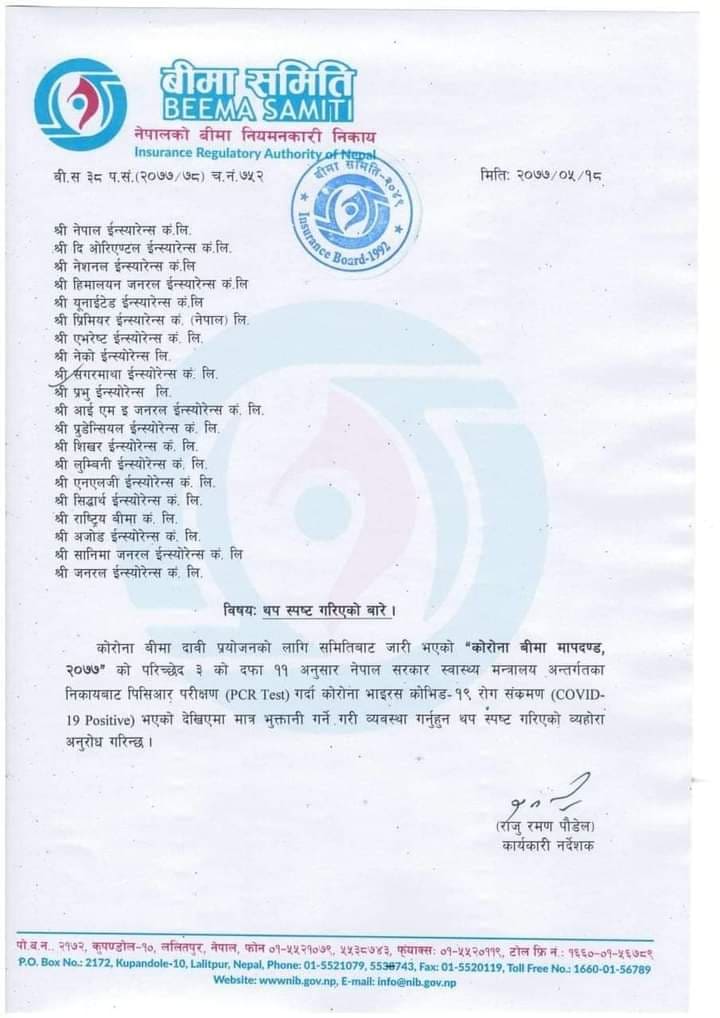 उक्त निर्देशन बमोजिम नेपालका संघीय अस्पतालहरुमा जडान गरिएका ल्याबमा परिक्षण गरिएको रिपोर्ट मात्रै कोरोना बीमा दावी भुक्तानीका लागि योग्य हुन्छन् । भन्नाले जिल्ला अस्पताल, क्षेत्रीय, अस्पताल, पुरानो अञ्चल अस्पतालदेखि हेल्थपोष्ट समेतमा पिसिआर परिक्षण गरेमा मान्यता पाउनेछन् भने देशकै ठूलो बीर अस्पताल, शिक्षण अस्पताल पाटन अस्पतालमा गरिएका परिक्षणहरु कोरोना बीमाका लागि योग्य हुँदैनन् ।
