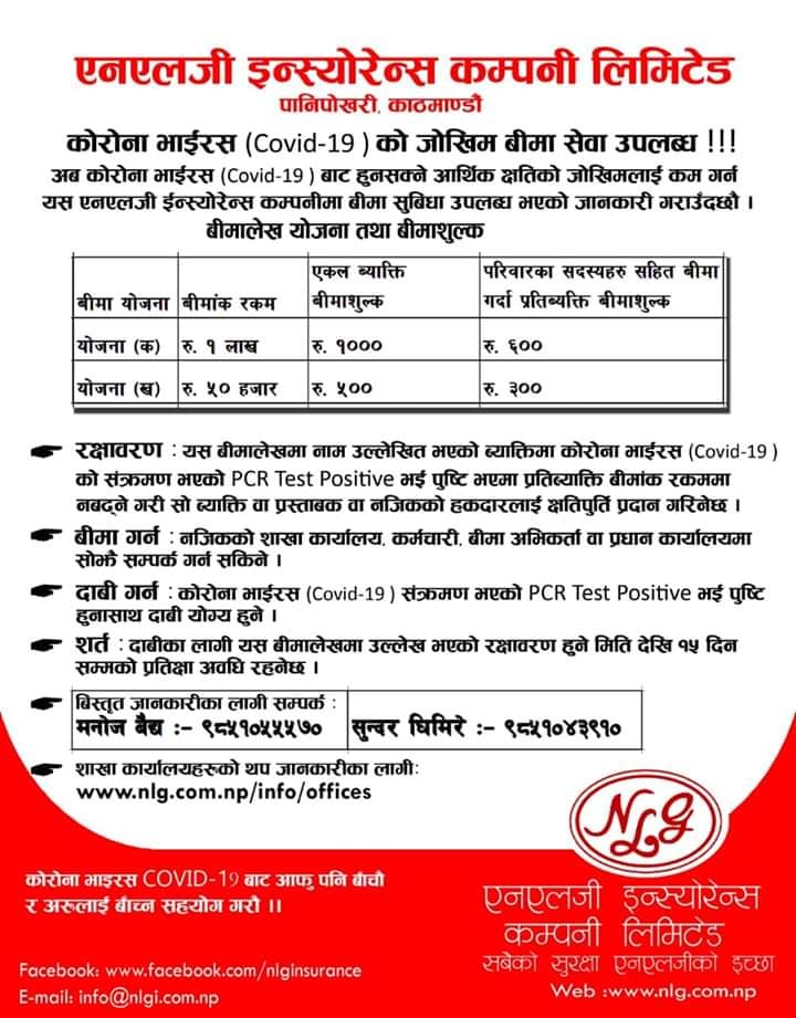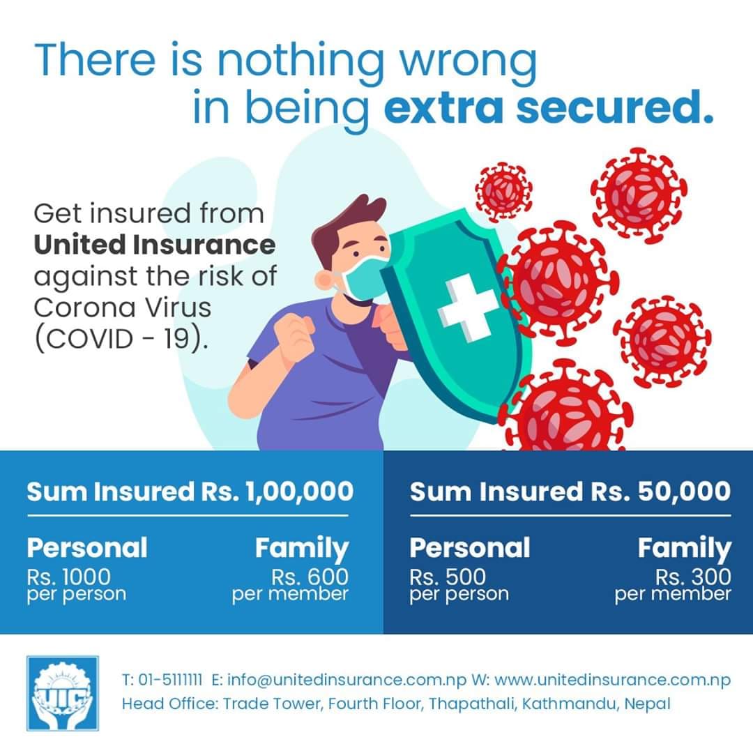 बीमा समितिले कोरोना रोग संक्रमणको पुष्टि हुने वित्तिकै एक लाख रुपैयाँ र ५० हजार रुपैयाँ गरी दुई वटा बीमांक रकम भएको योजनासहितको नयाँ बीमा पोलिसी जारी गरेको छ । सो बीमा पोलिसी नेपाल बीमक संघसँगको सहकार्यमा पुलमार्फत सञ्चालन गरिँदैछ । पुलमार्फत सञ्चालन हुने हुँदा सामूहिक जोखिम बहन हुनेछ । सो बीमा पोलिसी औपचारिक रुपमा आजबाट बिक्री सुरु हुँदैछ । बीमा समितिले औपचारिक कार्यक्रम गरेर कोरोना बीमाको औपचारिक सुरुवात गर्न लागेको बीमा समितिका सूचना अधिकारी निर्मल अधिकारीले बताए ।
