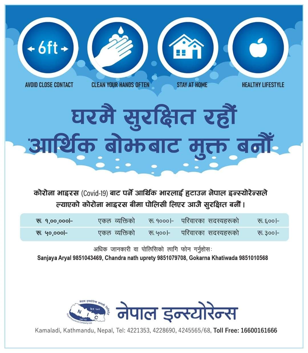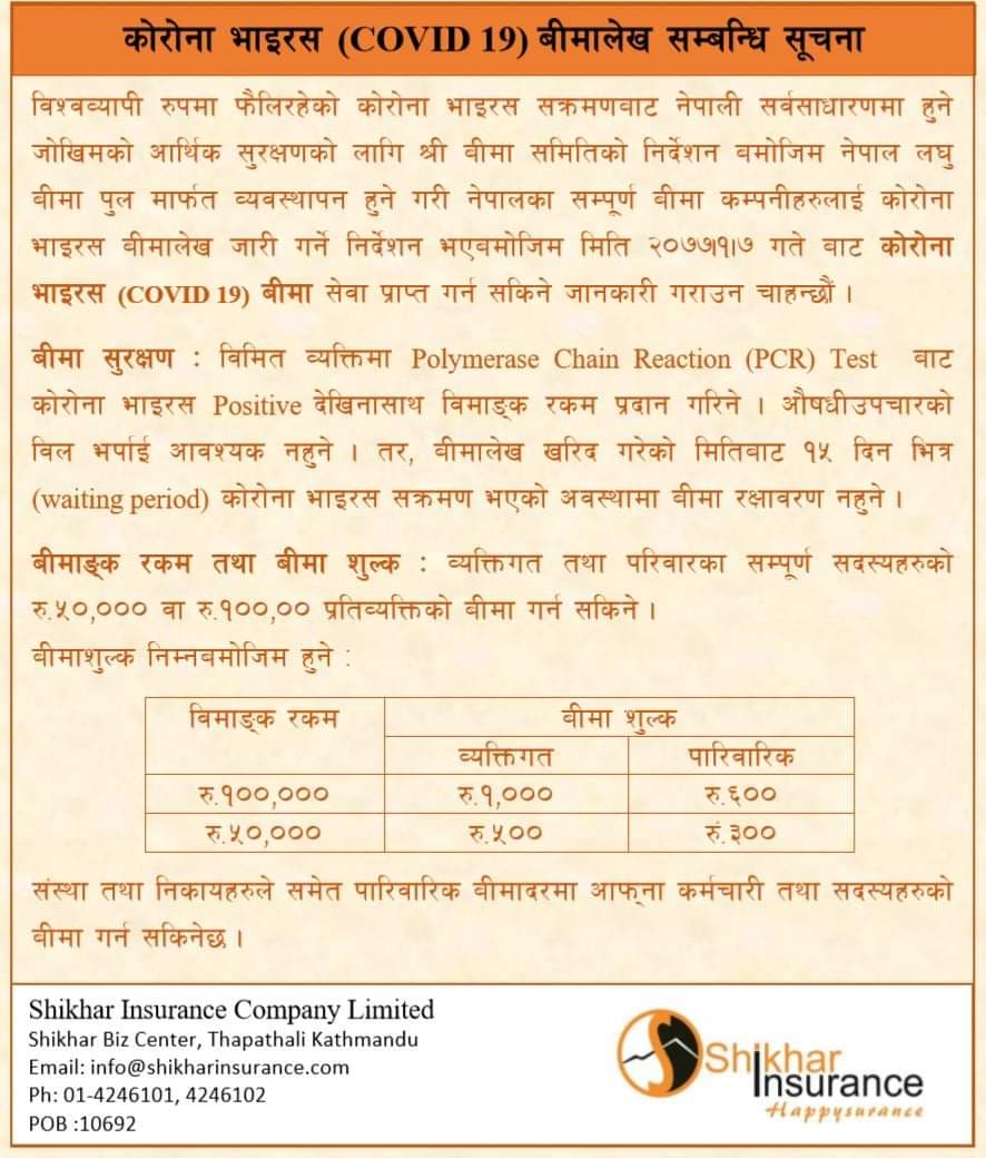 कोरोना रोगको सम्पूर्ण उपचार नेपाल सरकारले व्यहोर्ने भएपनि प्रोत्साहन, पौष्टिक आहार खर्च, रोजगारी गुम्दा हुने क्षतिलाई आधार मानेर एक लाख रुपैयाँ वा ५० हजार रुपैयाँ (जुन बीमा गरिएको छ सोही) भुक्तानी गर्ने गरी नयाँ पोलिसी बनाइएको बीमा समितिले जनाएको छ । कोरोना भाइरसको परिक्षण पिसिआरमा पोजेटिभ देखिने वित्तिकै बीमा दावी भुक्तानी हुनेछ ।