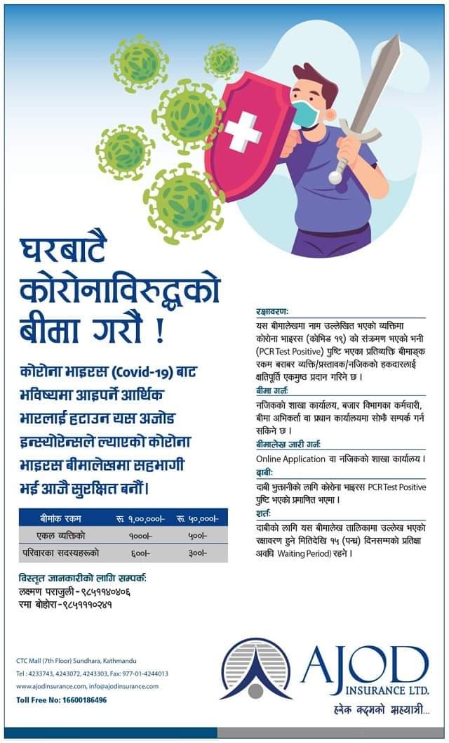 बीमा समितिले कोरोना रोग संक्रमणको पुष्टि हुने वित्तिकै एक लाख रुपैयाँ र ५० हजार रुपैयाँ गरी दुई वटा बीमांक रकम भएको योजनासहितको नयाँ बीमा पोलिसी जारी गरेको छ । सो बीमा पोलिसी नेपाल बीमक संघसँगको सहकार्यमा पुलमार्फत सञ्चालन गरिँदैछ । पुलमार्फत सञ्चालन हुने हुँदा सामूहिक जोखिम बहन हुनेछ । सो बीमा पोलिसी औपचारिक रुपमा आजबाट बिक्री सुरु हुँदैछ । बीमा समितिले औपचारिक कार्यक्रम गरेर कोरोना बीमाको औपचारिक सुरुवात गर्न लागेको बीमा समितिका सूचना अधिकारी निर्मल अधिकारीले बताए ।