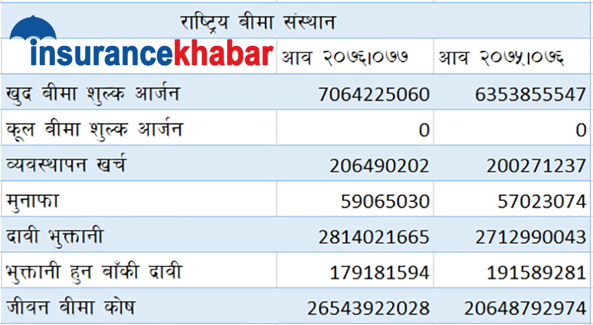 संस्थानको कारोबारको अनुपातमा मुनाफा भने धेरै छैन । गत आवमा संस्थानले पाँच करोड ९० लाख ६५ हजार ३० रुपैयाँ मुनाफा आर्जन गरेको छ । अघिल्लो वर्ष यस्तो मुनाफा पाँच करोड ७० लाख २३ हजार ७४ रुपैयाँ थियो । संस्थानको मुनाफामा समेत बृद्धि भएको छ । चुक्ता पुँजि १८ करोड १० लाख २० हजार रुपैयाँ रहेको संस्थान कम्पनी ऐन अन्तर्गत संस्थागत निकाय नभई स्वायत्त रुपमा बीमा संस्थान ऐन अन्तर्गत संगठित संस्था हो ।